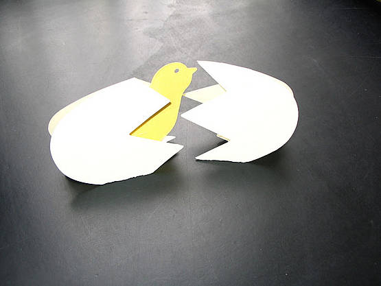 A small chick (Accucut C1700S) will fit inside the large cracked egg, if you bend up the feet. This egg was cut on a double folded piece of card stock, so that it can stand. The chick inside also had a double fold on its feet to make it stand. Tape the tops of the cuts together. You might also try a small dinosaur inside the egg. You could make "Resurrection Eggs" by putting inside Bible texts and small pictures to describe Jesus' death and resurrection.