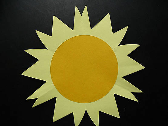 Fold a piece of paper into sixths, as when you make a snowflake. Have the point outside the three-toothed part's curve. Fill the center with a circle cut (Fraction Circle Whole AccuCut CD110L) and you have sun for the bulletin board.