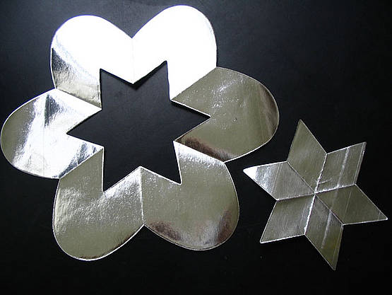 To make a star, fold a piece of paper into sixths. Place the point on the large center "tooth" with the bulk of the paper over the egg half that as a "V" in the middle. You may find the the waste part is also an attractive shape.