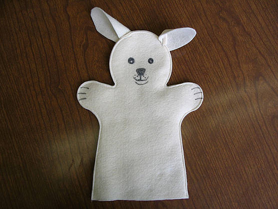 This simple little dog puppet was made to go with the book "Bark George" by Jules Feiffer. The felt body was sewn on a sewing machine. The ears were stapled in place.
