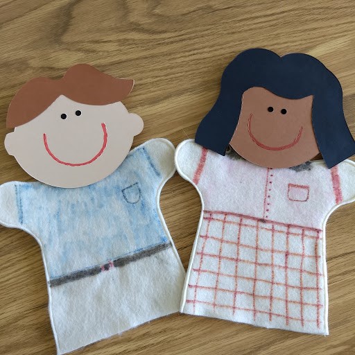 If you would rather not draw a face, try using the paper bag puppet heads for people or animals with the body. Make them from felt or paper and attach to the puppet body die.