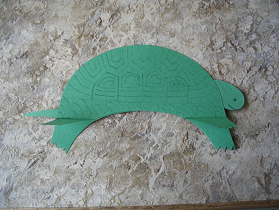 To make this turtle, fold a 12" x 18" sheet of construction paper in half. Place the paper edge opposite the fold on the brim of the die, with the visor ends pointing toward the fold. Cut. Use a small mitten die cut (AccuCut 1200S) for the head. Trim the visor ends to look like feet. Glue the two "shell" portions together, slipping the head into place and attaching a tail. Decorate with a shell pattern. Fold back the legs on each side and your turtle will be able to stand.